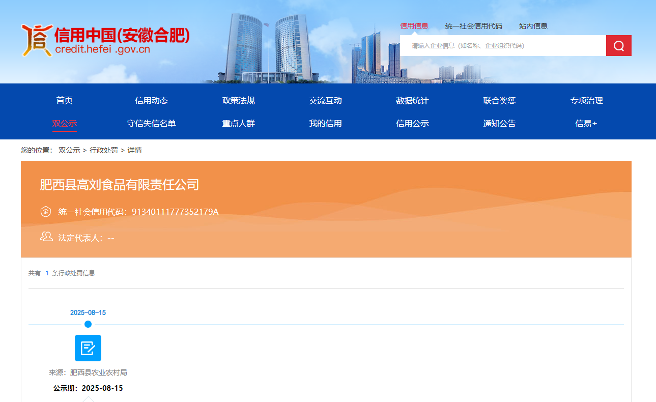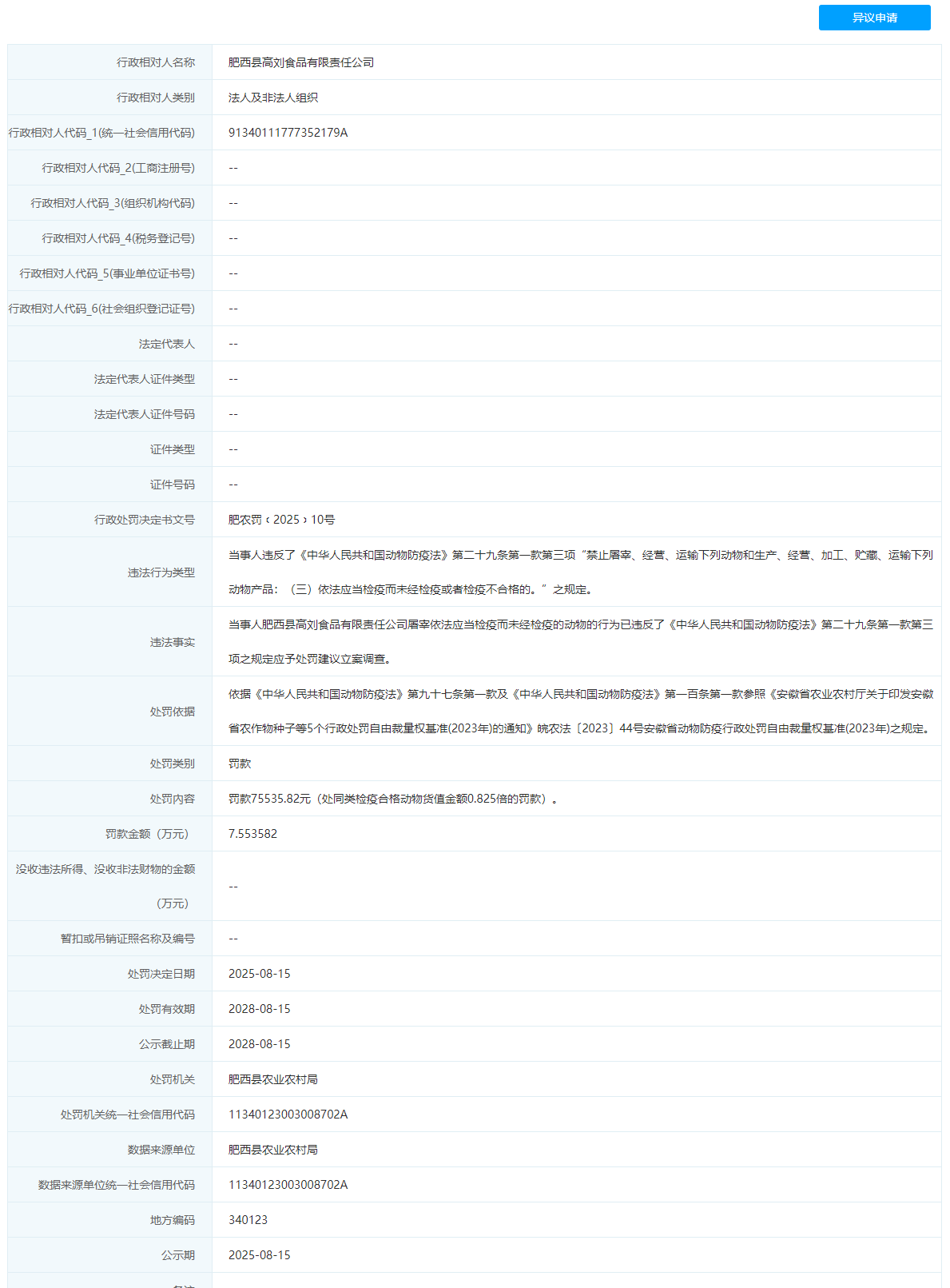 近日,信用合肥披露行政处罚信息,因违反动物防疫法,屠宰未经检疫的动物,肥西县高刘食品有限责任公司被处罚款7.553582,行政处罚决定书文号为肥农罚﹝2025﹞10号。