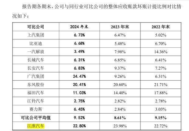 影响利润的主要因素之一是计提坏账,报告期各期末,与同行业可比公司的整体应收账款坏账计提比例对比显示,2022年至2024年,江淮汽车整体应收账款坏账约为34.27亿元、32.59亿元、33.65亿元,计提比例分别为22.72%、23.98%和22.80%,远高于同行业可比公司。