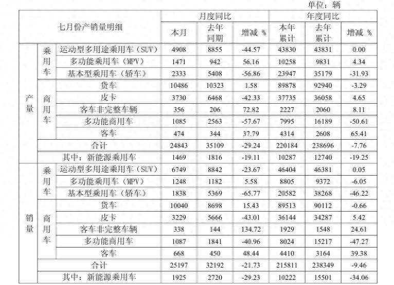 分车型看,乘用车板块全面遇冷:基本型乘用车(轿车)前7月销量同比下滑46.22%,SUV仅微增0.05%,MPV下滑6.05%;商用车中,多功能商用车销量同比下滑40.96%,皮卡同比下滑43.01%。