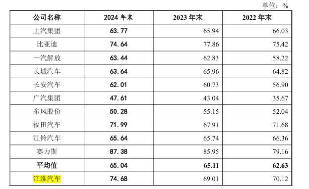 不过,江淮汽车回复审核问询函中,也将更多问题暴露出来。截至2024年底,江淮汽车总负债高达366.52亿元,较上年增长13.58%,资产负债率攀升至74.68%,远超上汽集团、长城汽车等同行65%左右的平均水平,处于行业高位。