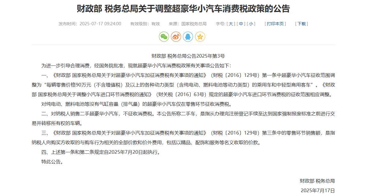 尊界上市的甜蜜期仅仅持续不到一个月时间,“豪车税”即给江淮汽车当头一击。7月17日,财政部与国家税务总局宣布,自7月20日起,超豪华小汽车消费税起征点从130万元下调至90万元,征税范围覆盖所有动力类型的乘用车。根据政策,将对含税零售价超过101.7万元的车辆征收10%消费税。