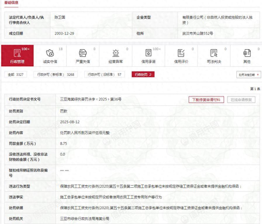 内容显示,中建三局集团的违法事实是:施工总承包单位未按规定开设或者使用农民工工资专用账户等行为。对此,三亚市综合行政执法局海棠分局对其罚款8.75万元。行政处罚决定书文号:三亚海棠综执普罚决字﹝2025﹞第36号。