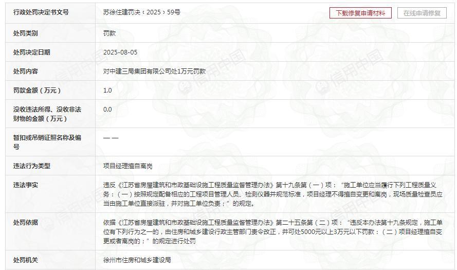 此外,在8月5日,中建三局集团还因“项目经理擅自离岗”,被徐州市住房和城乡建设局罚款1万元。行政处罚决定书文号:苏徐住建罚决﹝2025﹞59号。