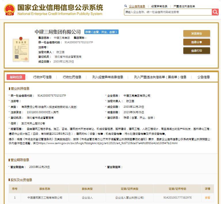 国家企业信用信息公示系统显示,中建三局集团有限公司成立于2003年,注册资本1531800万元人民币,法定代表人陈卫国,公司由中国建筑第三工程局有限公司全资持股。