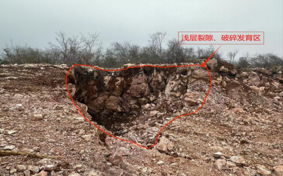 2.池州海螺乌石山矿东采区+244 米东南侧隐伏溶洞浅表岩层 裂隙、破碎发育,且裂隙、破碎间充填物为第四系粘土,其不具 有良好的胶结性,粘结性差。受雨水冲刷作用一定程度造成溶洞 土壤松动、结构破坏。