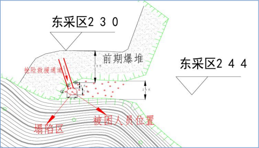 事故地点位于乌石山矿东采区+244 米平台东南侧塌陷区,处 于已施工 1 号、2 号、3 号孔侧后方(爆堆后方),塌陷区呈椭圆 形,其东西向长约 9 米、南北向宽约 7 米、洞深可见部分约 5 米。 溶洞局部向下延伸,说明该塌陷区存在一处深度不详的溶洞。经 现场勘测,1 号孔位于塌陷区西侧约 1 米,处于完整状态;2 号孔