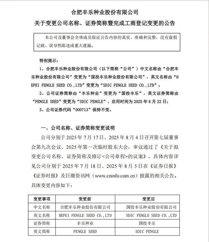 8月22日,合肥丰乐种业股份有限公司(000713.SZ)发布公告,公司正式更名为“国投丰乐种业股份有限公司”,证券简称由“丰乐种业”变更为“国投丰乐”,证券代码“000713”保持不变。