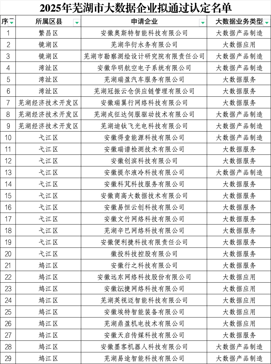依据《芜湖市大数据企业培育认定实施细则(试行)》(芜数资〔2022〕14号),根据申报通知要求,经研究拟确定安徽奥斯特智能科技有限公司等29家企业为芜湖市大数据企业,现予以公示。公示时间自公示之日起5个工作日,如有意见和建议,请向芜湖市数据资源管理局“数字芜湖”建设工作推进科或市工信局工业互联网与信息产业科反映,反映方式以来人、署名来信(包括电子信函)为准,对匿名方式提出异议的不予受理。2025市大数据企业拟通过认定名单见附件。