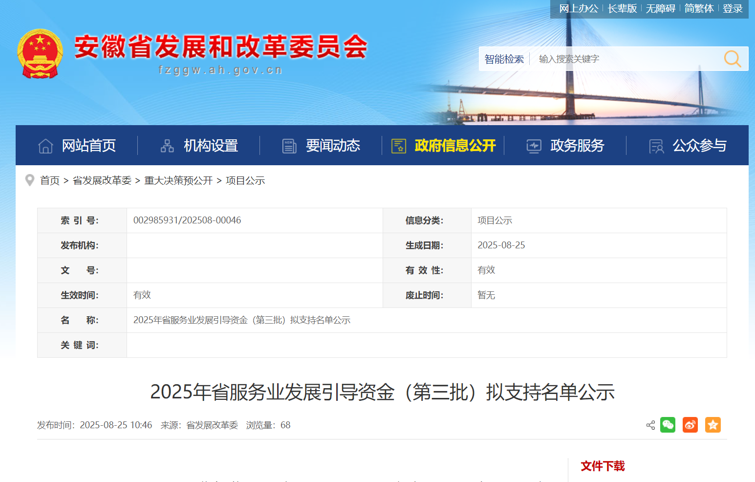 现将2025年省服务业发展引导资金(第三批)拟支持名单予以公示。公示时间自公示之日起5个工作日,如有意见和建议,请向安徽省发展和改革委员会贸服处反映,反映方式以来人或署名来信(包括电子信函),对匿名方式提出异议的不予受理。