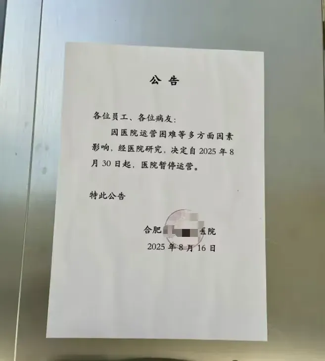 网友发布的照片截图显示,因医院运营困难等多方面因素影响,经医院研究,决定自2025年8月30日起,医院暂停运营。