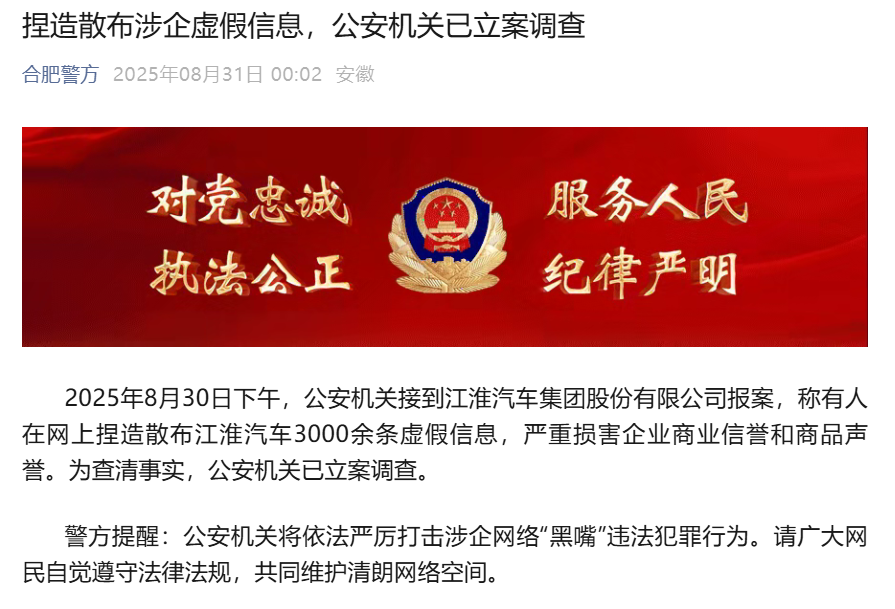 2025年8月30日下午,公安机关接到江淮汽车集团股份有限公司报案,称有人在网上捏造散布江淮汽车3000余条虚假信息,严重损害企业商业信誉和商品声誉。为查清事实,公安机关已立案调查。