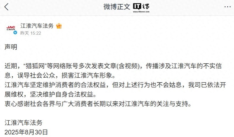 8月30日稍早,江淮汽车法务发布声明,称“猎狐网”等网络账号近期多次发表文章(含视频),传播涉及江淮汽车的不实信息,公司已依法开展维权。