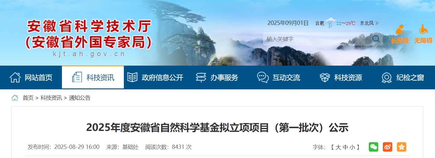 根据《安徽省自然科学基金管理办法(修订)》(皖科基奖〔2020〕16号),经组织申报、各依托单位推荐、形式审查、专家评审,现将2025年度安徽省自然科学基金青年项目(A类延续资助)、青年项目(A类)、青年项目(B类)、青年项目(C类)及面上项目的拟立项项目予以公示。公示期为7天,期间如单位和个人对公示的项目持有异议,请以真实身份向省科技厅书面反映并提供相应材料。提出异议的单位或个人应当提供联系方式,个人提出异议的,应当在书面异议材料上签署真实姓名;以单位名义提出异议的,应当加盖本单位公章。异议超出公示期限的不予受理。