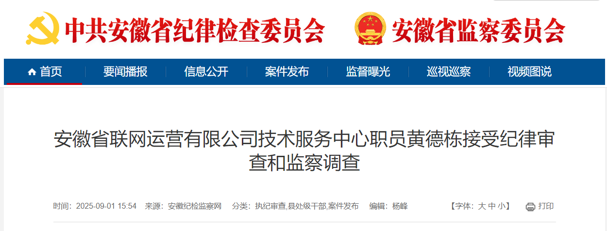 安徽省联网运营有限公司技术服务中心职员黄德栋涉嫌严重违纪违法,目前正接受安徽省交通控股集团有限公司纪委纪律审查;经指定管辖,接受芜湖市无为市监察委员会监察调查。(安徽省交通控股集团有限公司纪委、芜湖市无为市纪委监委)