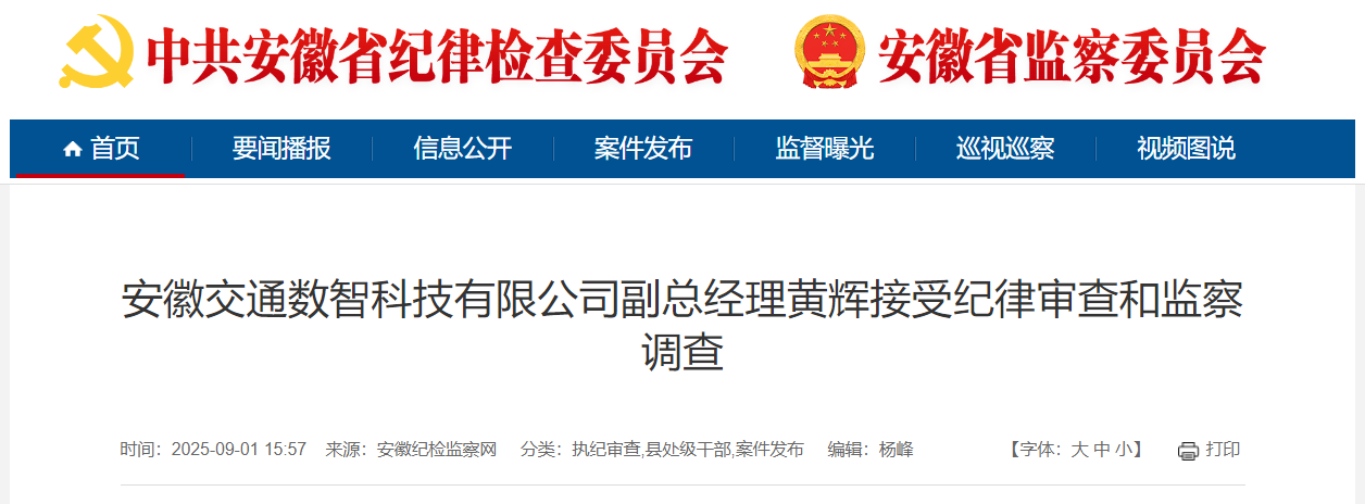 安徽交通数智科技有限公司副总经理黄辉涉嫌严重违纪违法,目前正接受安徽省交通控股集团有限公司纪委纪律审查;经指定管辖,接受芜湖市繁昌区监察委员会监察调查。(安徽省交通控股集团有限公司纪委、芜湖市繁昌区纪委监委)