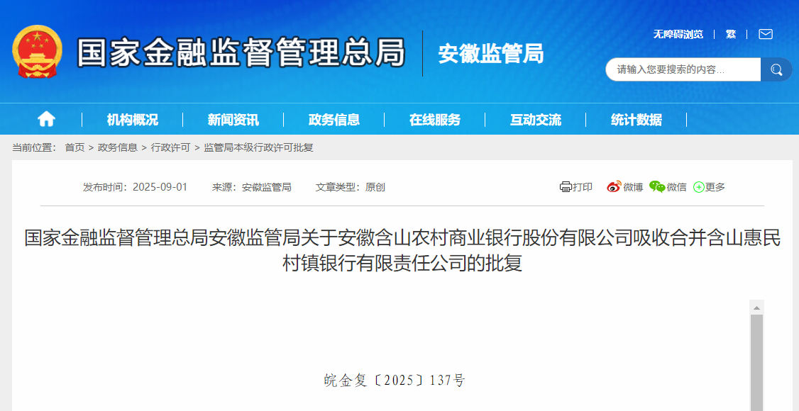 《安徽含山农村商业银行股份有限公司关于吸收合并含山惠民村镇银行有限责任公司的请示》(含农商字〔2025〕112号)收悉。经审核,现批复如下: