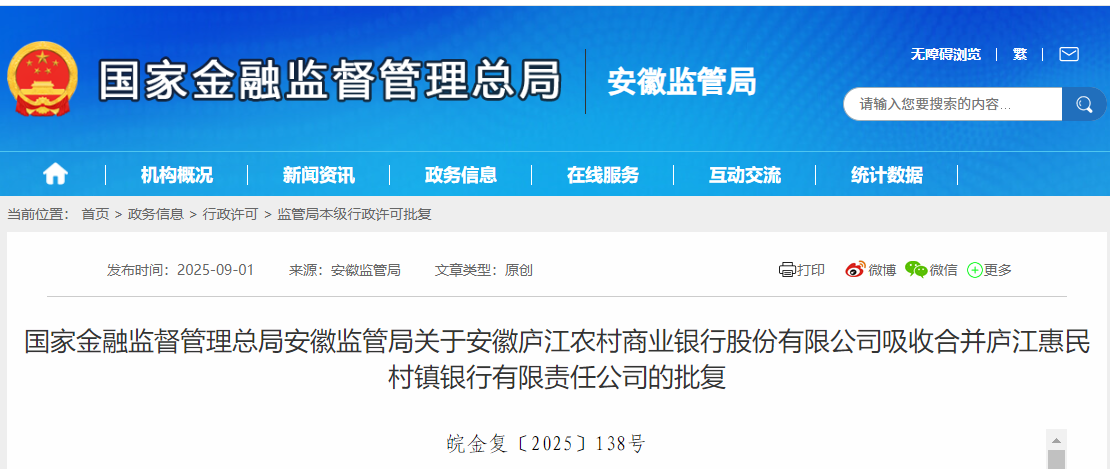 《安徽庐江农村商业银行股份有限公司关于吸收合并庐江惠民村镇银行有限责任公司的请示》(庐农商银发〔2025〕129号)收悉。经审核,现批复如下: