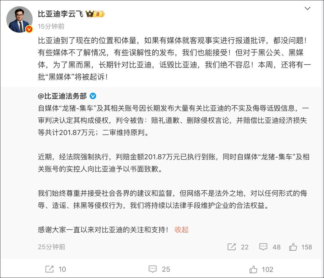 9月2日,比亚迪集团-品牌及公关处总经理@比亚迪李云飞 转发后发文:比亚迪到了现在的位置和体量,如果有媒体就客观事实进行报道批评,都没问题!有些媒体不了解情况,有些误解性的发布,我们也能接受!但对于黑公关、黑媒体,为了黑而黑,长期针对比亚迪,诋毁比亚迪,我们绝不容忍!本周,还有一批“黑媒体”将被起诉!