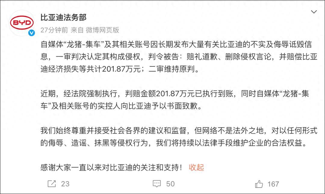 今天,@比亚迪法务部 发文:自媒体“龙猪-集车”及其相关账号因长期发布大量有关比亚迪的不实及侮辱诋毁信息,一审判决认定其构成侵权,判令被告:赔礼道歉、删除侵权言论,并赔偿比亚迪经济损失等共计201.87万元;二审维持原判。