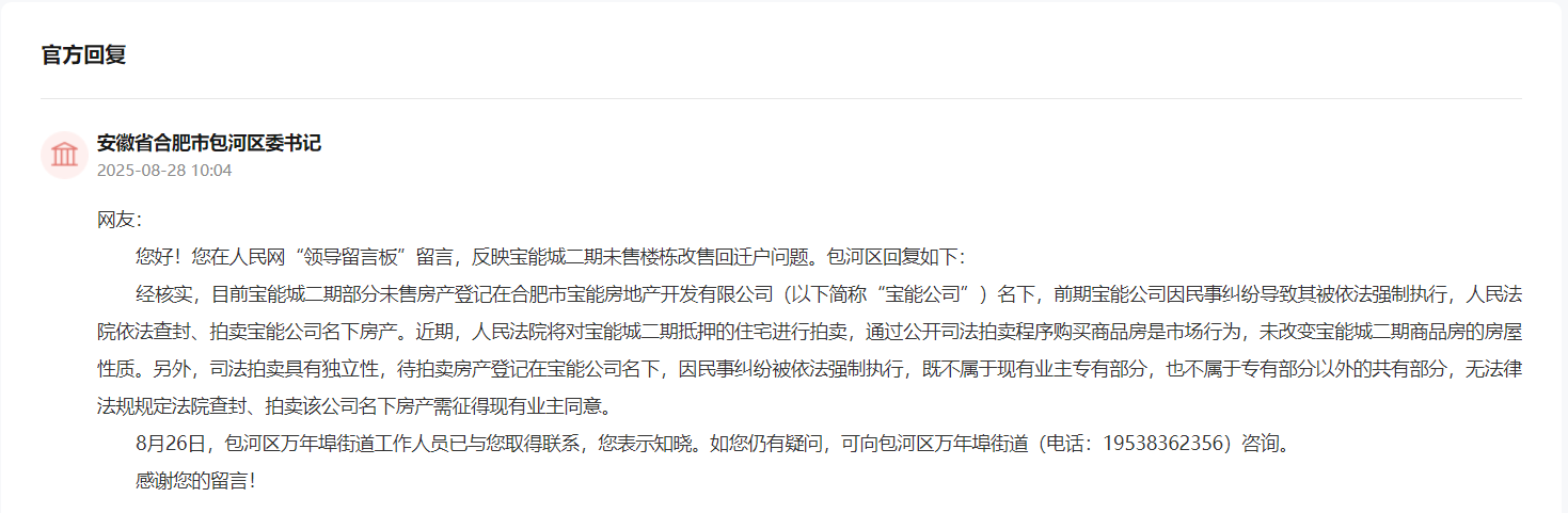 8月28日,官方回复表示,经核实,目前宝能城二期部分未售房产登记在合肥市宝能房地产开发有限公司(以下简称“宝能公司”)名下,前期宝能公司因民事纠纷导致其被依法强制执行,人民法院依法查封、拍卖宝能公司名下房产。