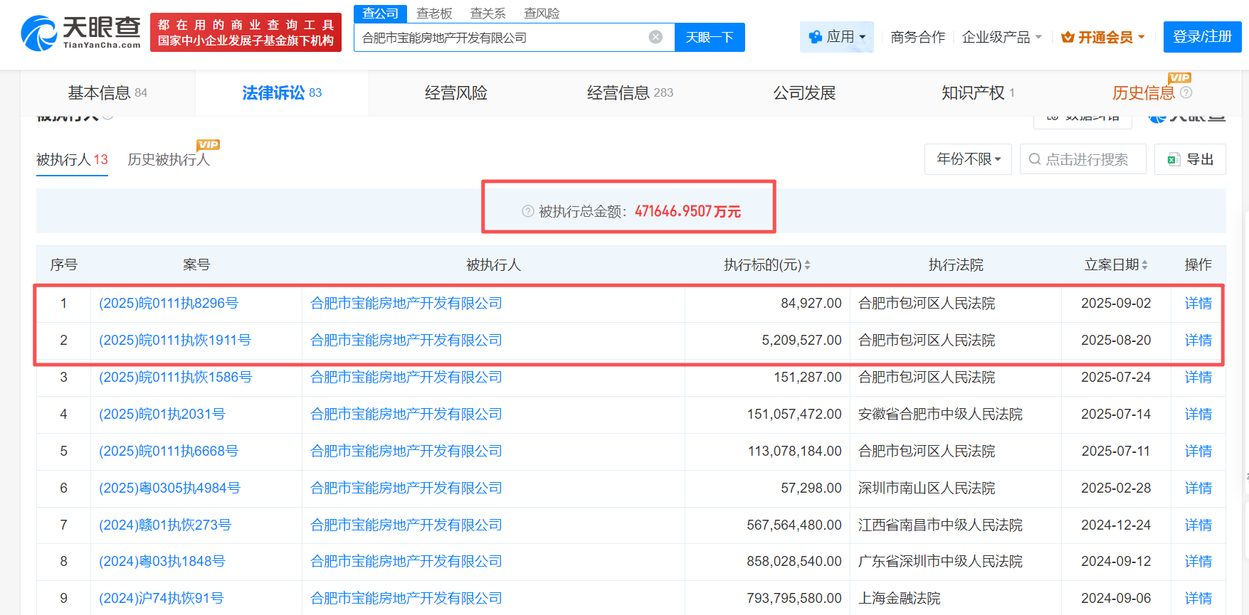 天眼查信息显示,合肥市宝能房地产开发有限公司被执行总金额为471646.9507万元。