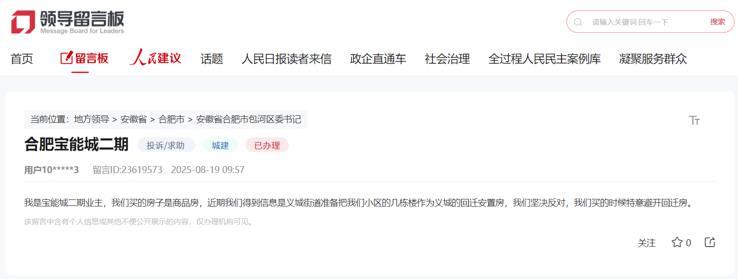 近日,据人民网领导留言板消息,有网友留言投诉宝能城二期部分商品房被作为回迁安置房。合肥市包河区官方回复。