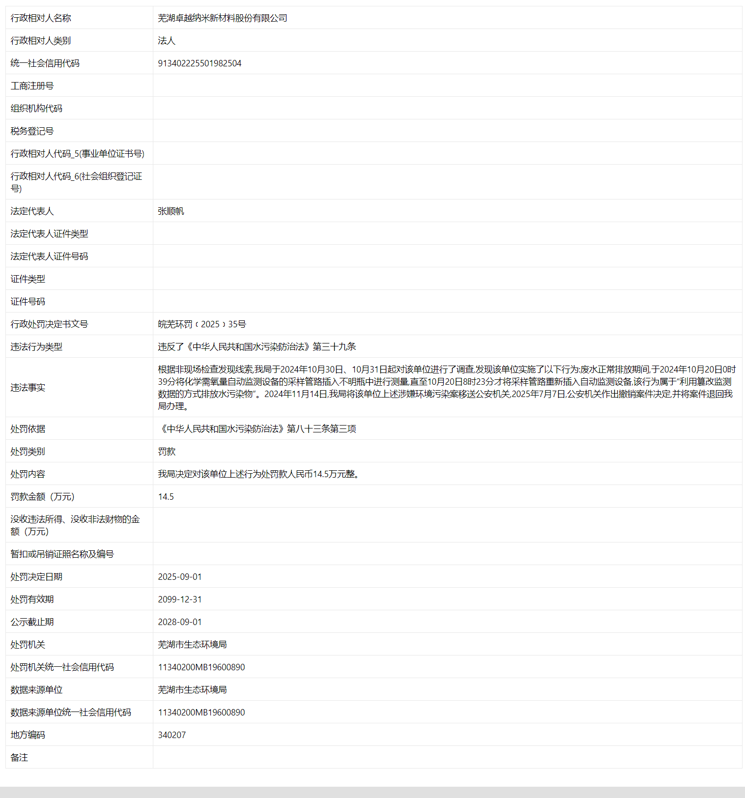 近日,信用芜湖披露行政处罚信息,因利用篡改监测数据的方式排放水污染物,芜湖卓越纳米新材料股份有限公司被罚款14.5万元,行政处罚决定书文号为皖芜环罚﹝2025﹞35号。