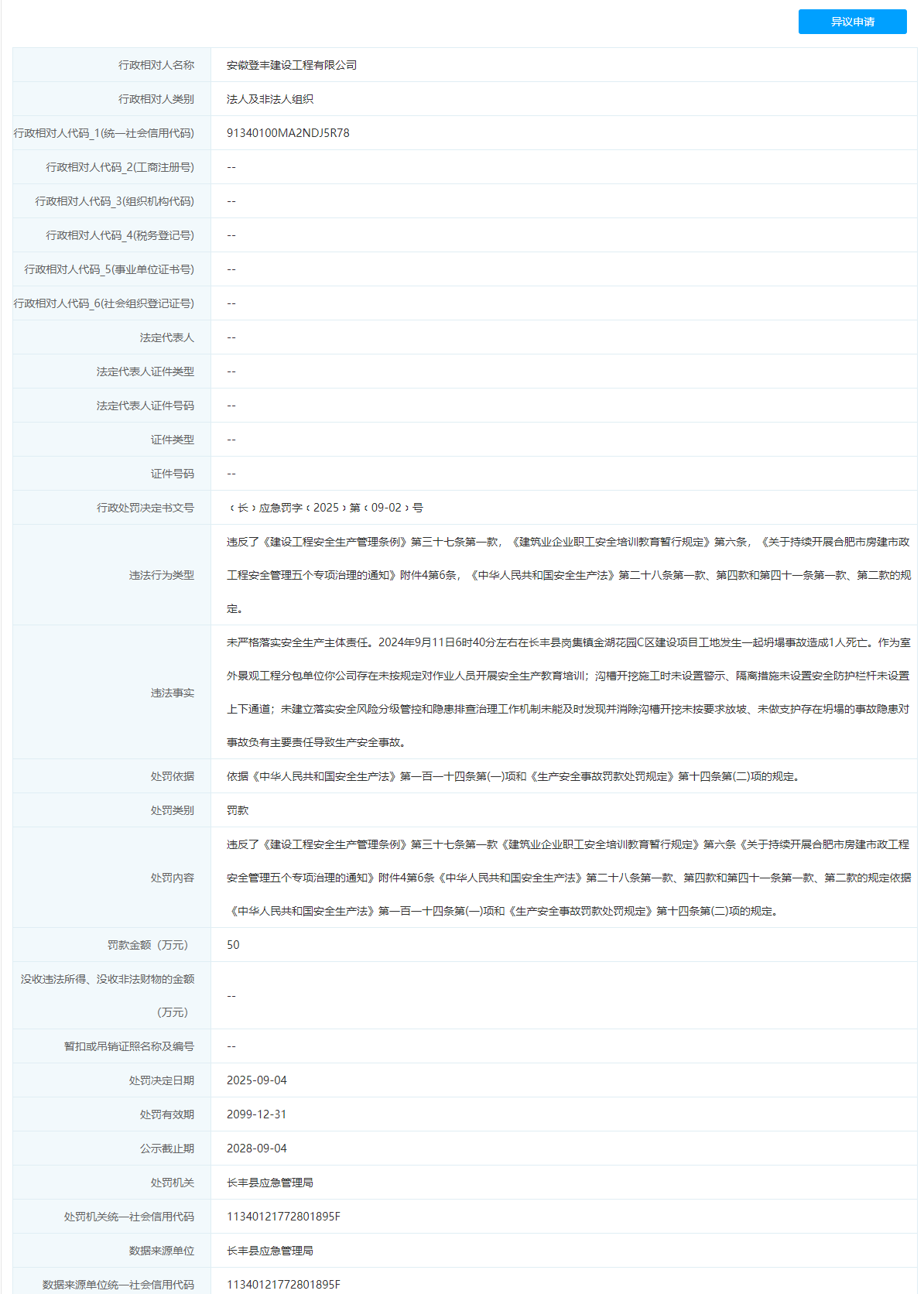近日,信用合肥披露行政处罚信息,因未严格落实安全生产主体责任,对一起坍塌致死事故负有主要责任,安徽登丰建设工程有限公司被罚款50万元,行政处罚决定书文号为﹝长﹞应急罚字﹝2025﹞第﹝09-02﹞号。