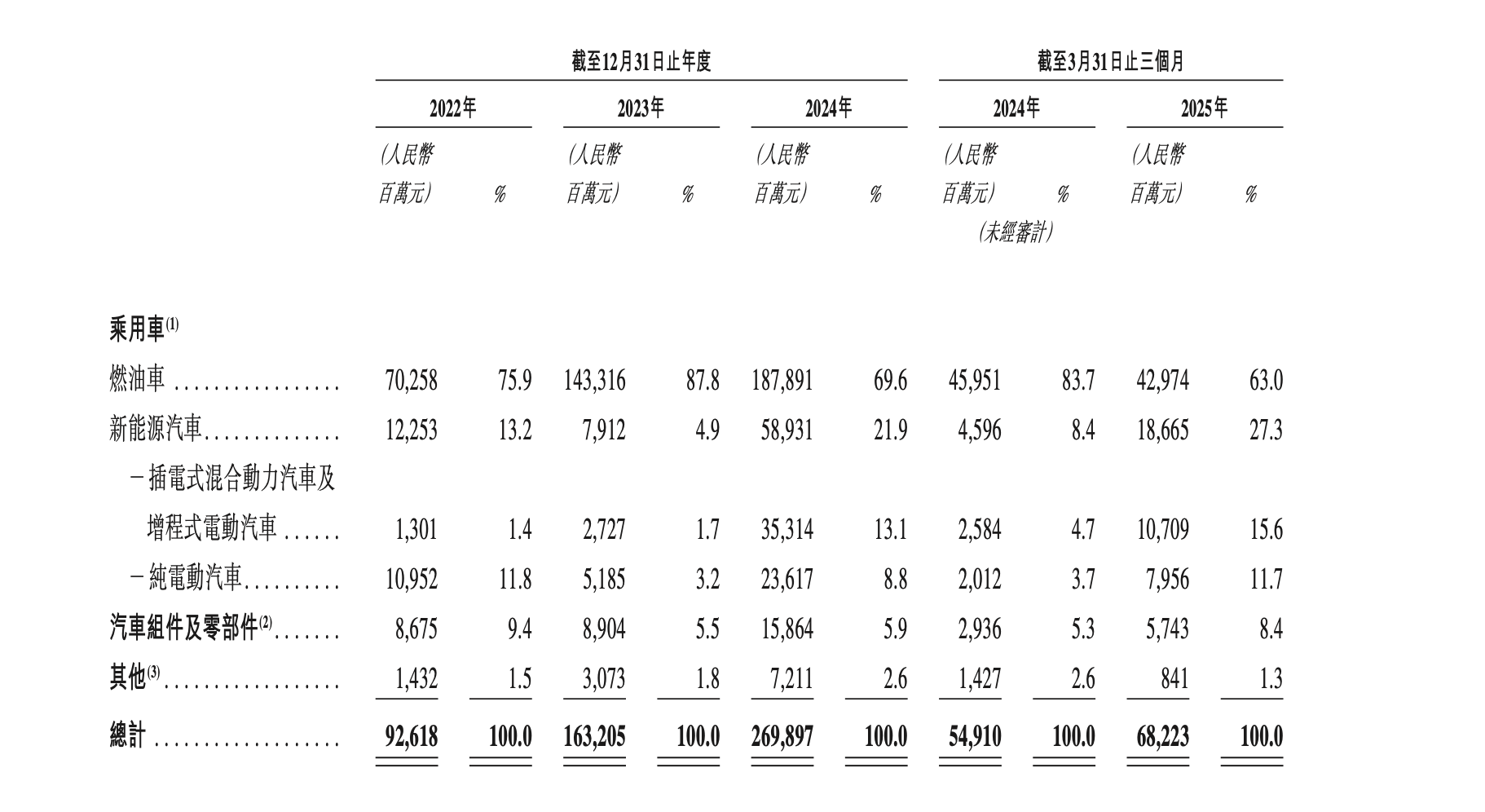 反映在收入上,燃油车业务贡献大头。根据招股书,奇瑞汽车2022年、2023年、2024年、2025年一季度的燃油车收入占比分别为75.9%、87.8%、69.6%、63.0%,新能源汽车收入占比分别为13.2%、4.9%、21.9%、27.3%。