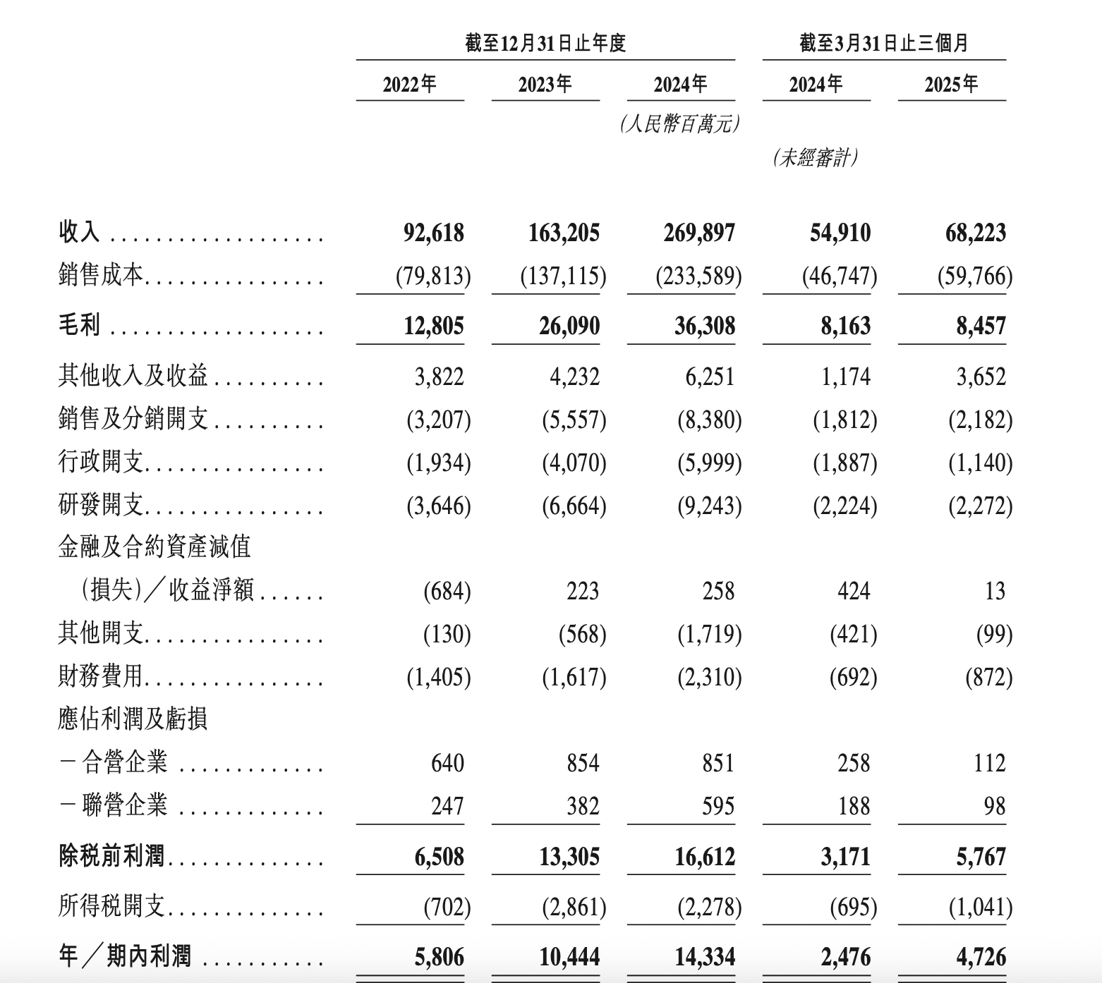 根据奇瑞汽车披露的招股书,奇瑞汽车近年来营收和净利润持续增长。2022年、2023年、2024年以及2025年一季度,奇瑞分别实现营收926.18亿元、1632.05亿元、2698.97亿元、682.23亿元;分别实现净利润58.06亿元、104.44亿元、143.34亿元、47.26亿元。