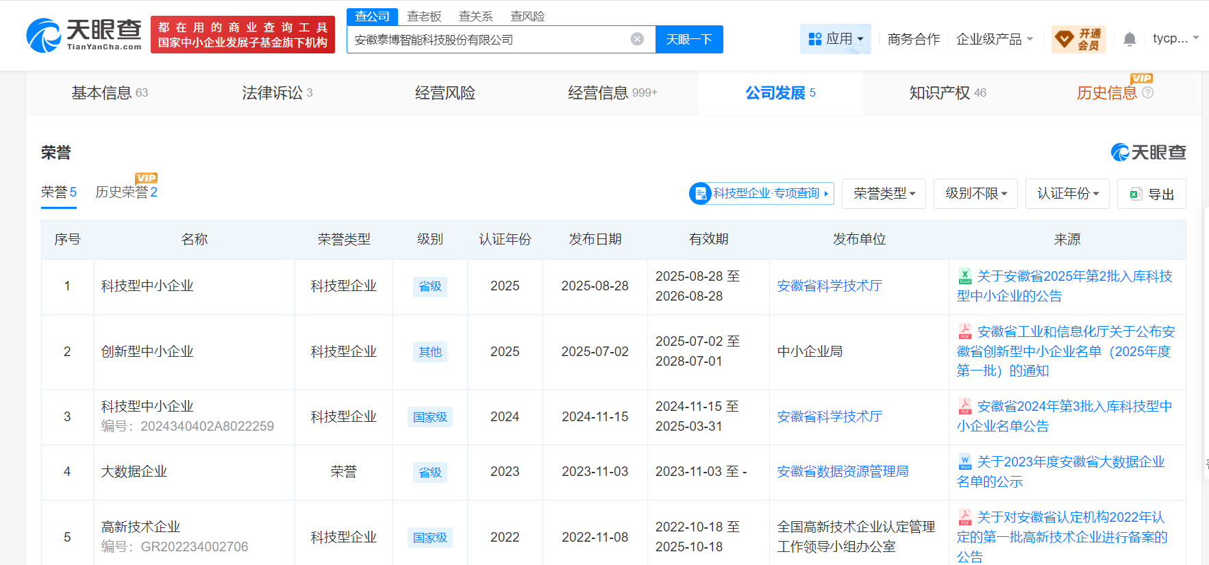 官方信息显示,安徽泰博智能科技股份有限公司曾入选2023年度安徽省大数据企业公示名单,系国家级高新技术企业(有效期至2025年10月18日)、技型中小企业(有效期至2025年3月31日),省级科技型中小企业。
