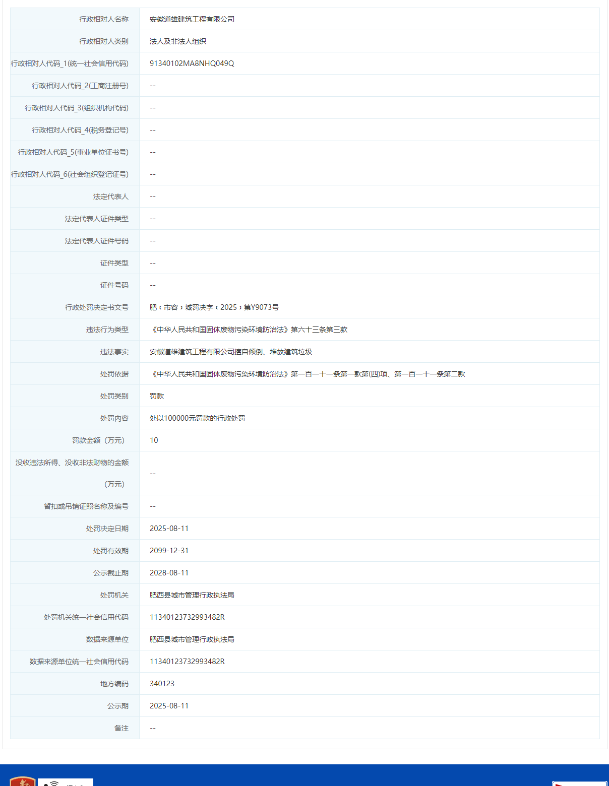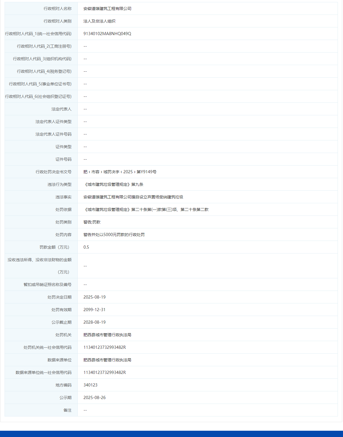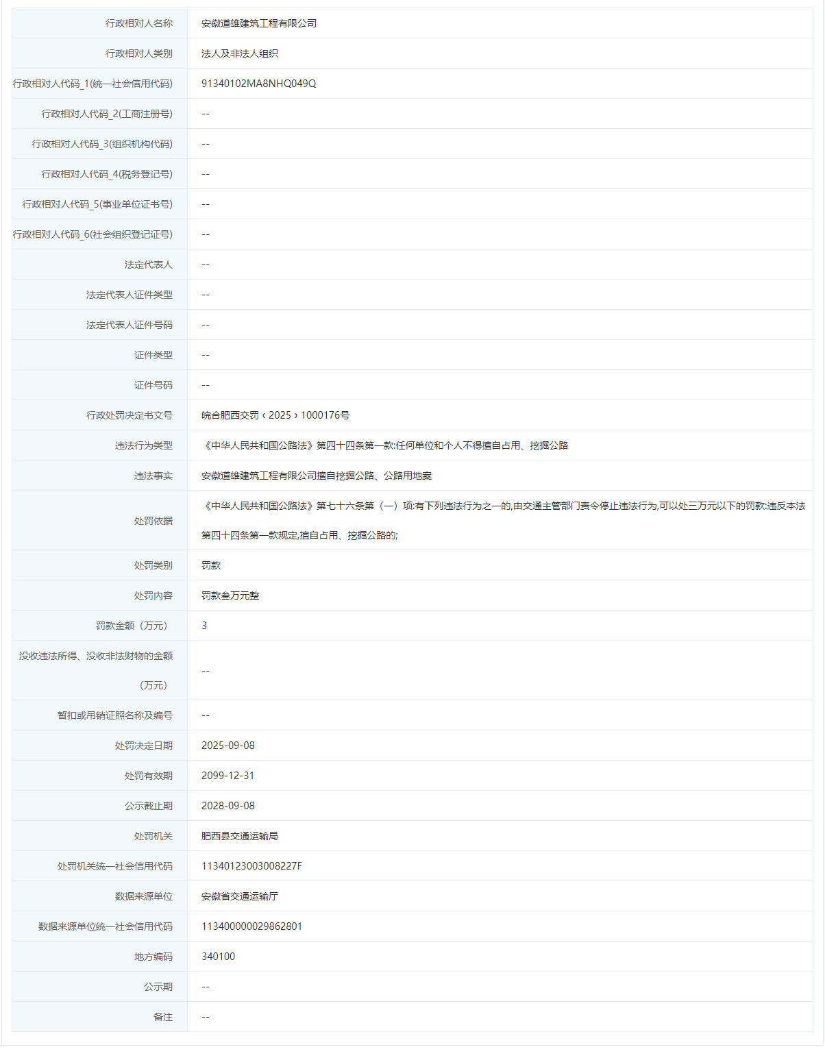 近日,信用合肥披露行政处罚信息,因擅自挖掘公路、公路用地,安徽道雄建筑工程有限公司被罚3万,行政处罚决定书文号为皖合肥西交罚﹝2025﹞1000176号。