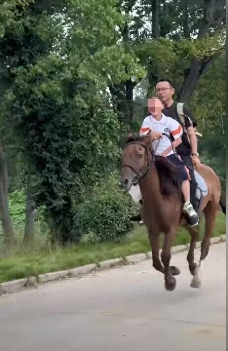 9日,何先生对极目新闻记者表示,家里开了农庄,养了几匹马。女儿今年11岁,上小学四年级,喜欢马,但还不能自己骑。从去年下半年开始,何先生在天气好的时候就骑马接女儿放学,从农庄到学校也就约一公里的路程,他不会骑上大马路,就在小路上跑,一周大概骑马接两三次。