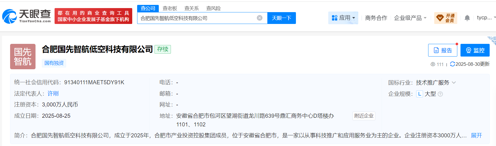 天眼查信息显示,近日,合肥国先智航低空科技有限公司成立,法定代表人为许刚,注册资本3000万元,经营范围包含物联网技术研发;互联网安全服务;大数据服务;卫星技术综合应用系统集成;人工智能应用软件开发等。