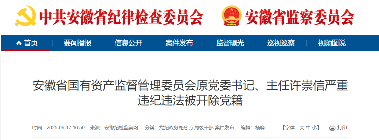 日前,经中共安徽省委批准,安徽省纪委监委对省国有资产监督管理委员会原党委书记、主任许崇信严重违纪违法问题进行了立案审查调查。