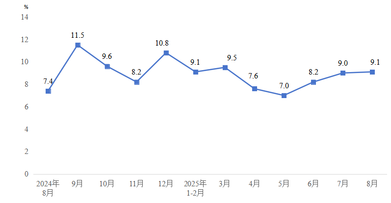 2025年8月份,全省规模以上工业增加值同比增长9.1%(以下增加值增速均为扣除价格因素的实际增长率)。