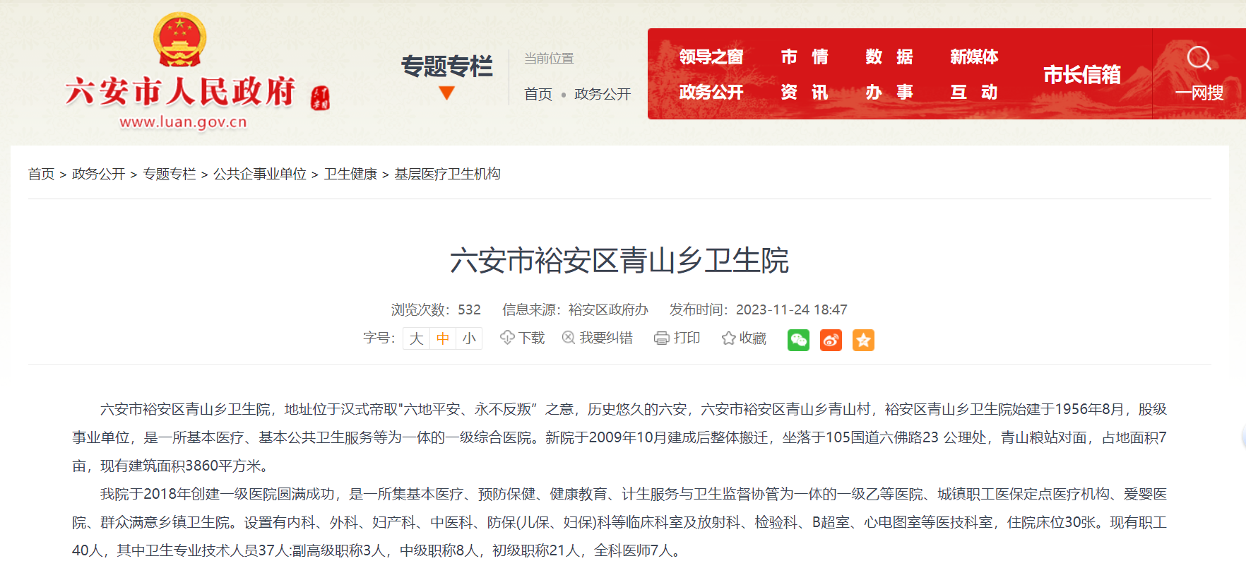 据六安市人民政府网站简介信息,六安市裕安区青山乡卫生院,始建于1956年8月,股级事业单位,是一所基本医疗、基本公共卫生服务等为一体的一级综合医院。