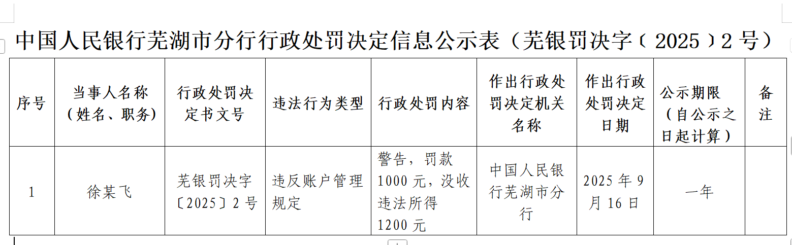 近日,中国人民银行安徽省分行网站披露行政处罚信息,违反账户管理规定,中国人民银行芜湖市分行对徐某飞作出警告,罚款1000元,没收违法所得1200元。行政处罚决定书文号为芜银罚决字〔2025〕2号。