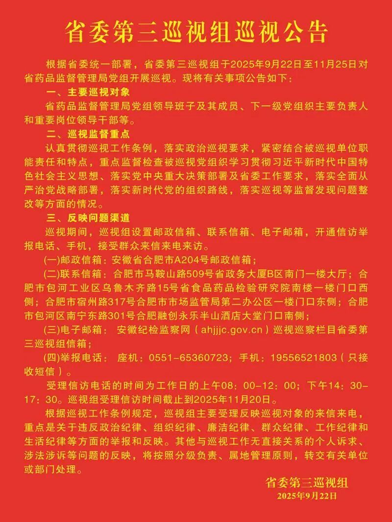 根据省委统一部署,省委第三巡视组于2025年9月22日至11月25日对省市场监督管理局党组开展巡视。现将有关事项公告如下: