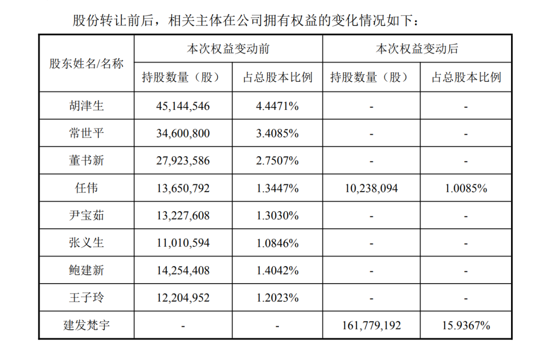 根据交易安排,上述8名自然人(构成一致行动人关系)拟向建发梵宇转让合计1.62亿股公司股份,占公司总股本的15.94%。为巩固控制权,公司股东、董事长任伟还承诺自股份交割日起,放弃其持有的剩余1.0085%股份对应的表决权。