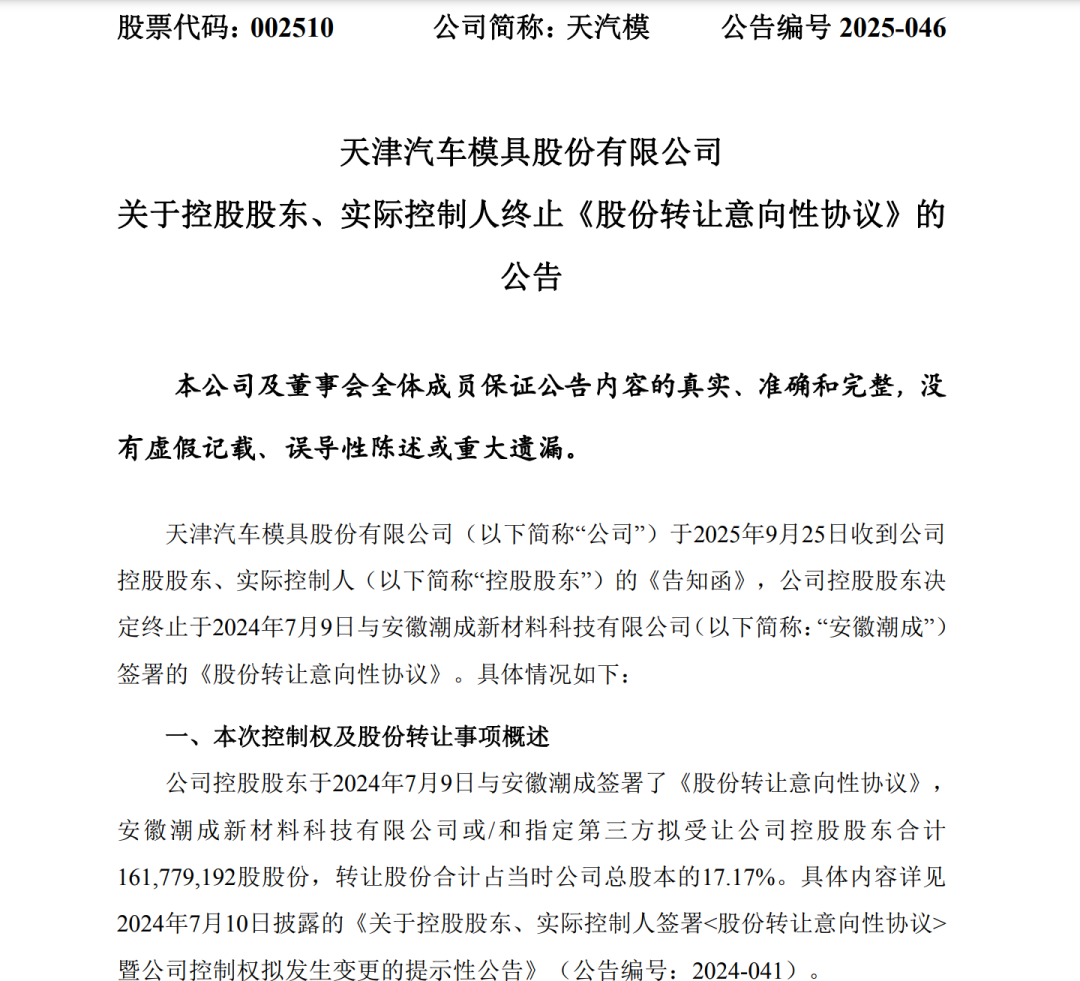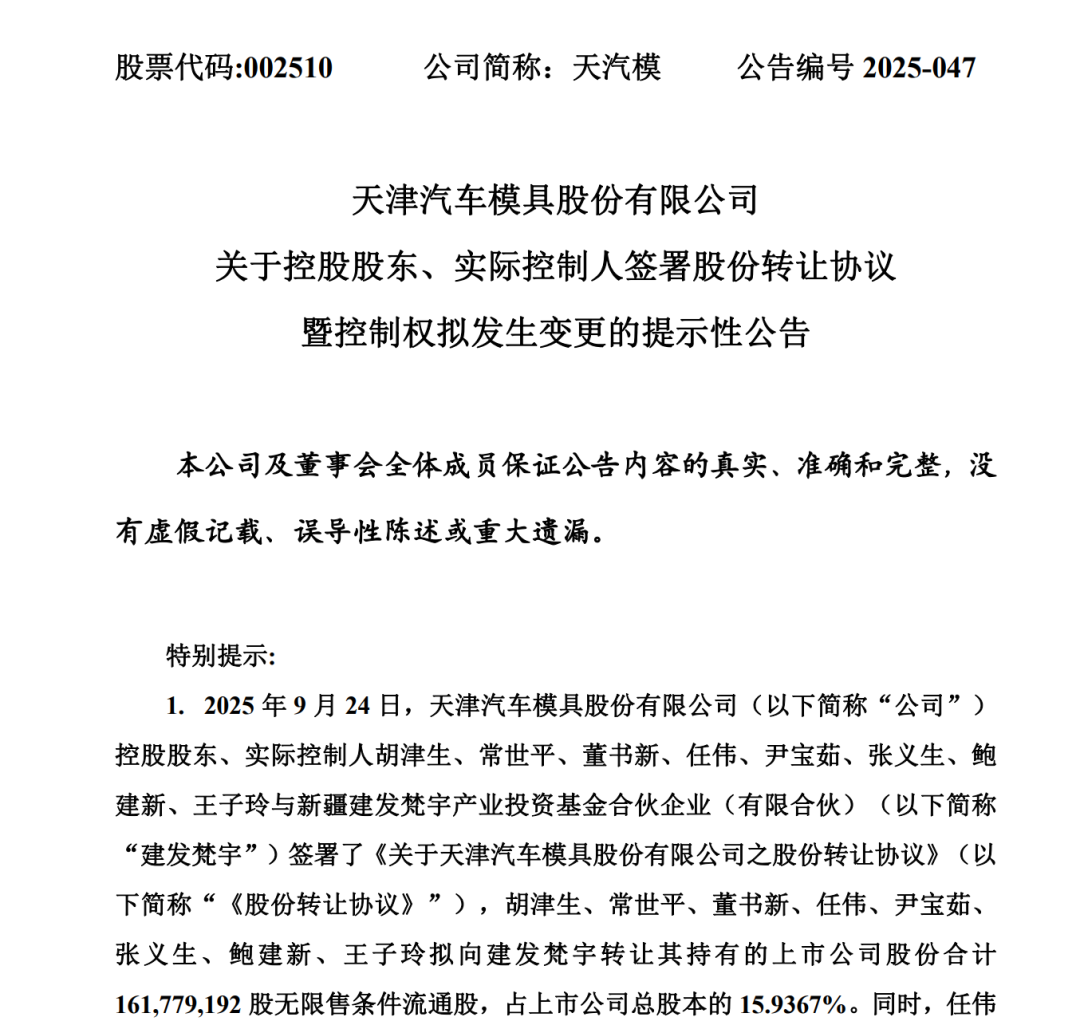 9月25日晚间,天汽模(证券代码:002510)接连发布两则公告,宣告其控制权变更事项迎来重大转折。