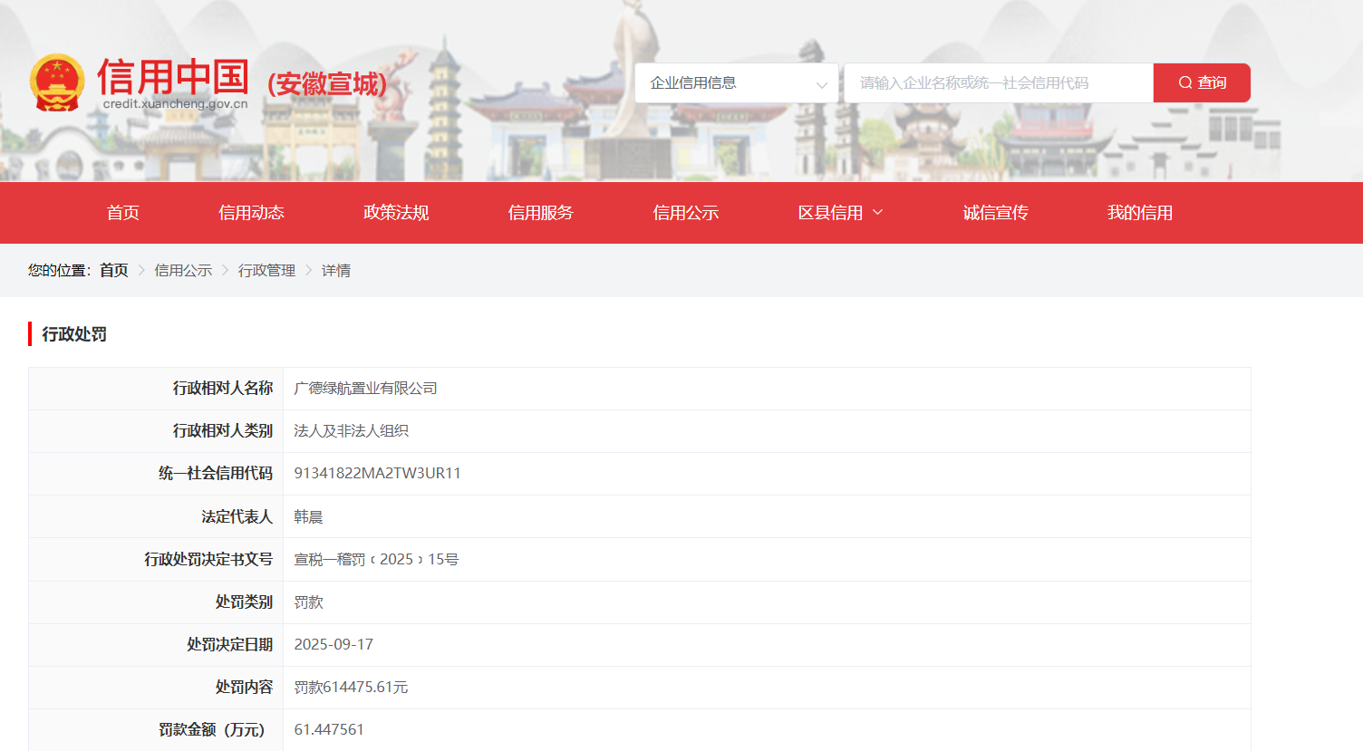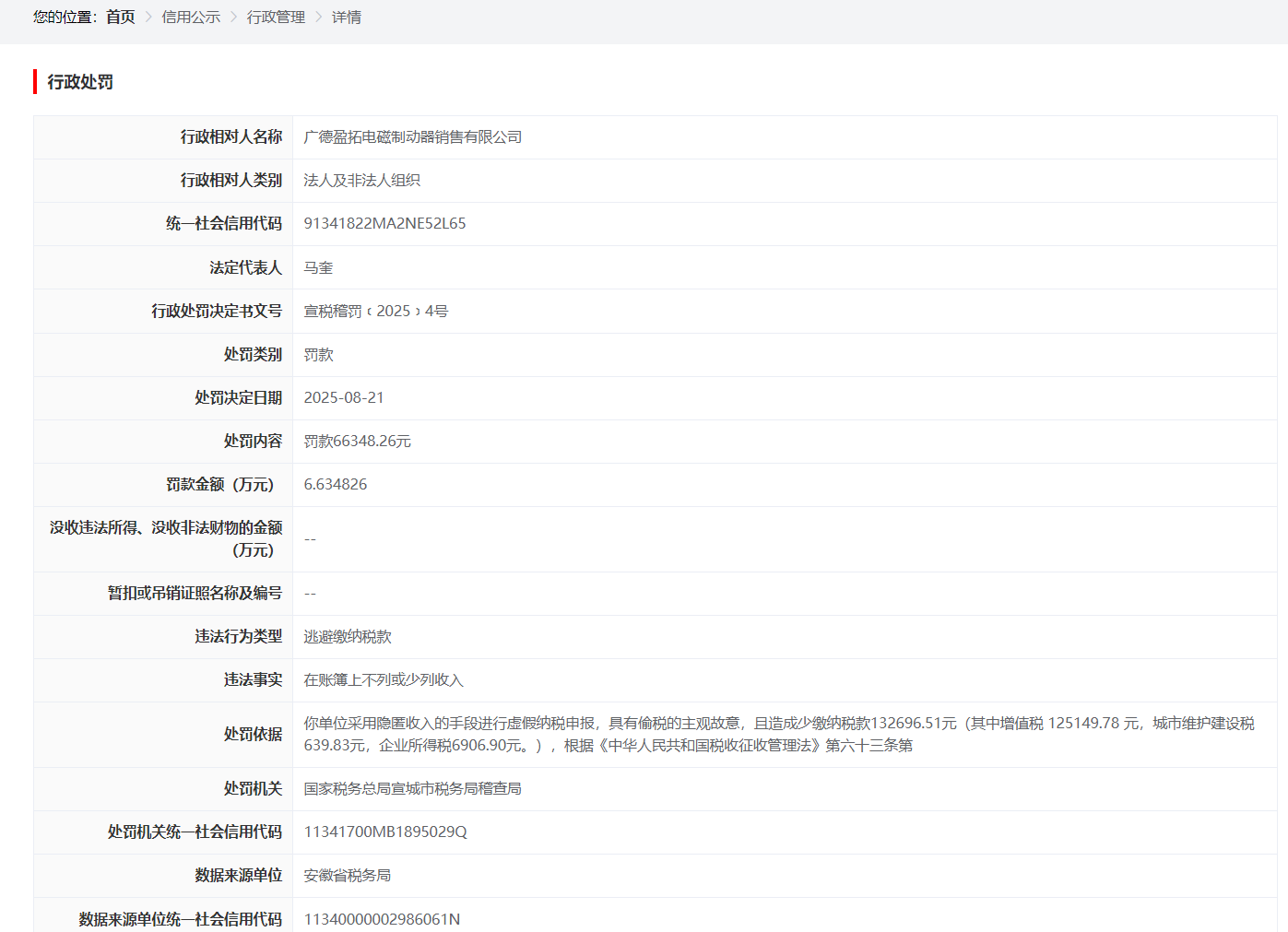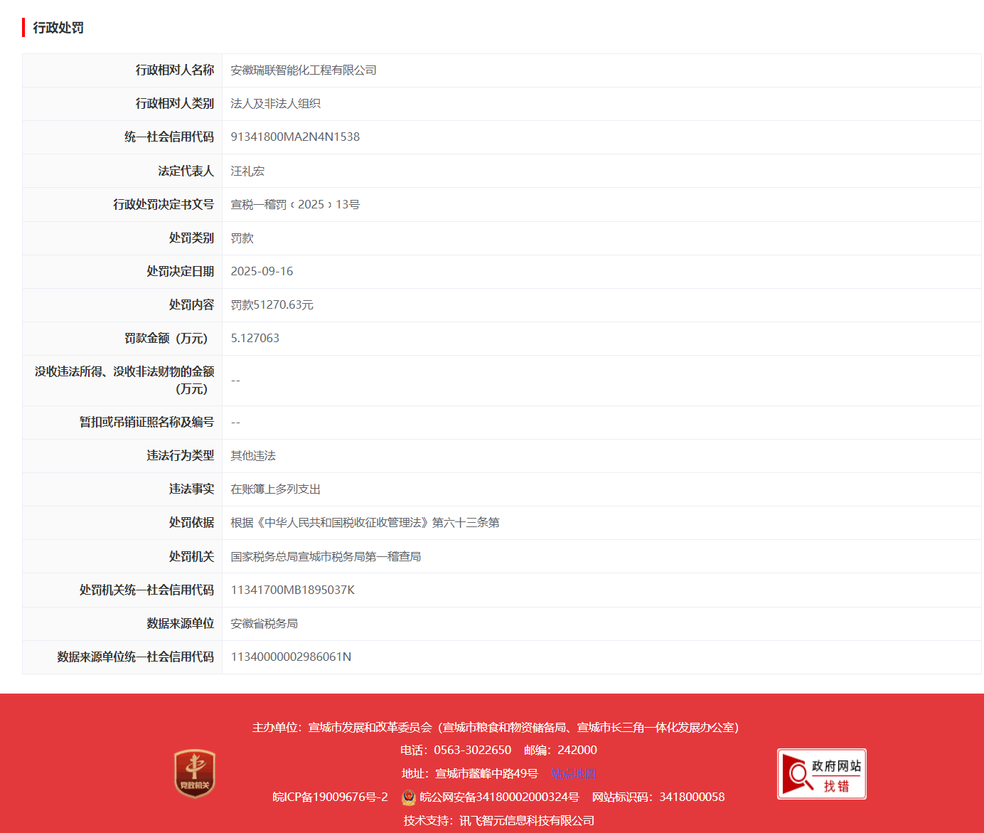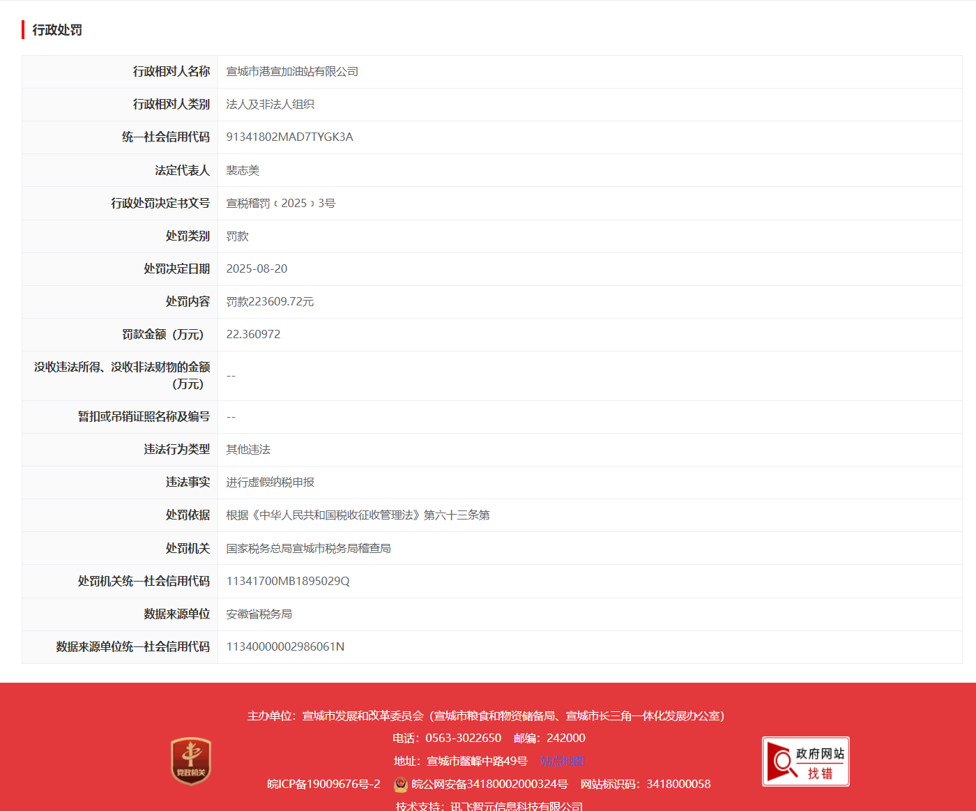 具体信息显示,涉税务违法的公司分别为广德绿航置业有限公司、安徽晶智新能源有限公司、安徽瑞联智能化工程有限公司、宣城市胜永信息文化有限公司、广德盈拓电磁制动器销售有限公司、宣城市港宣加油站有限公司、宁国市大龙桩基工程有限公司。