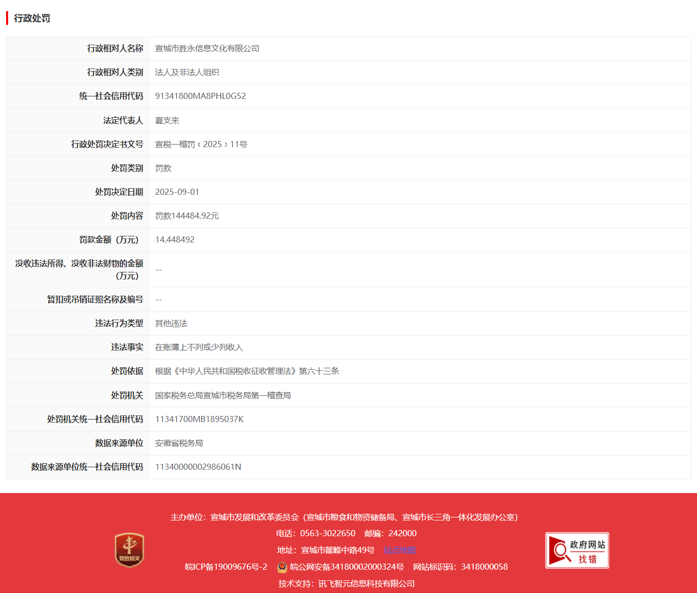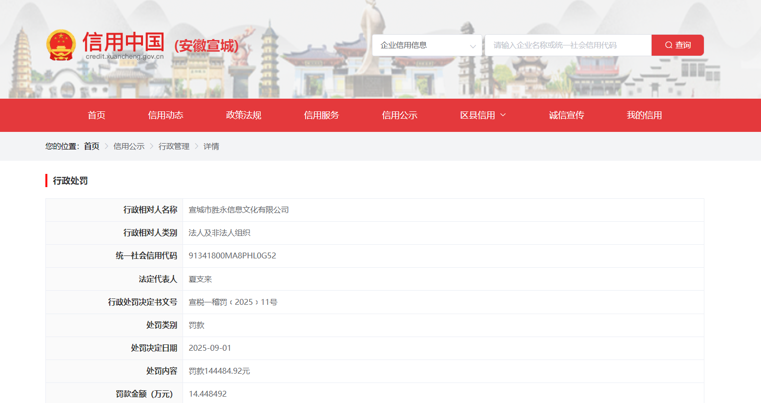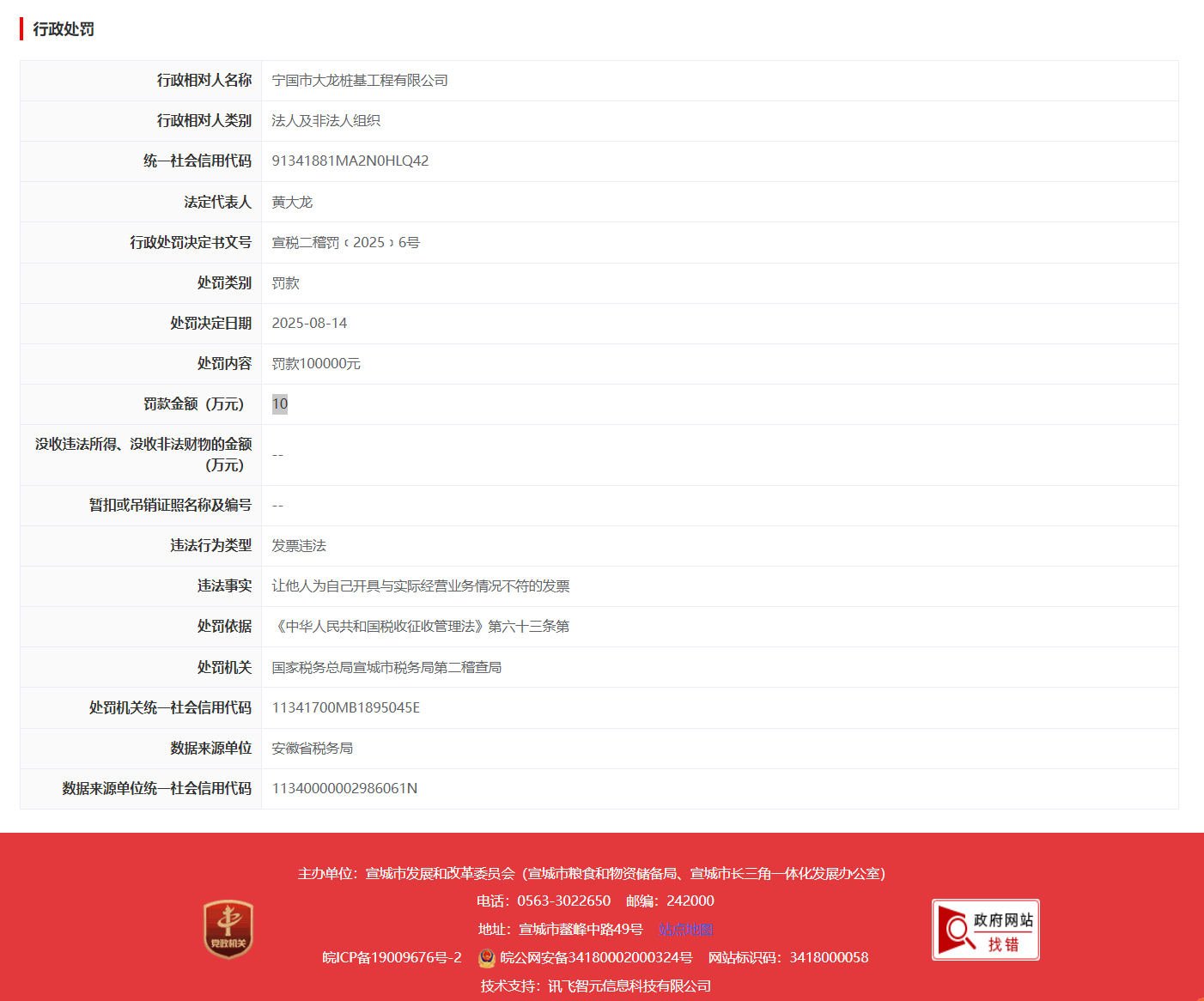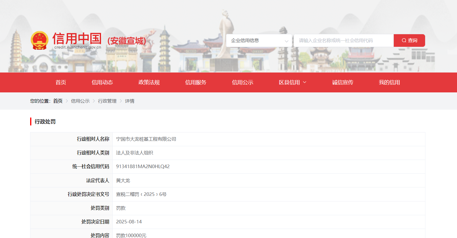 近日,信用宣城披露行政处罚信息,因发票违法、逃避缴纳税款等,宣城七家公司合计被罚款187.618914万元,行政处罚决定书文号分别为宣税一稽罚﹝2025﹞11号、13号、15号,宣税稽罚﹝2025﹞3-5号,宣税二稽罚﹝2025﹞6号。