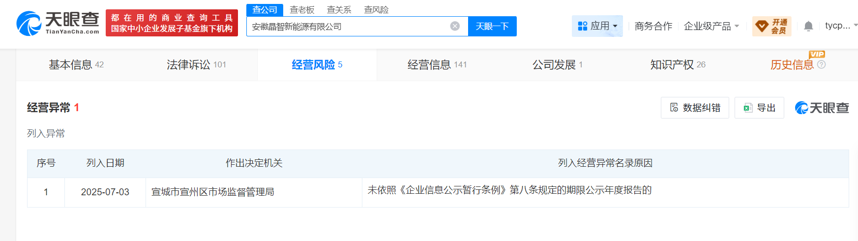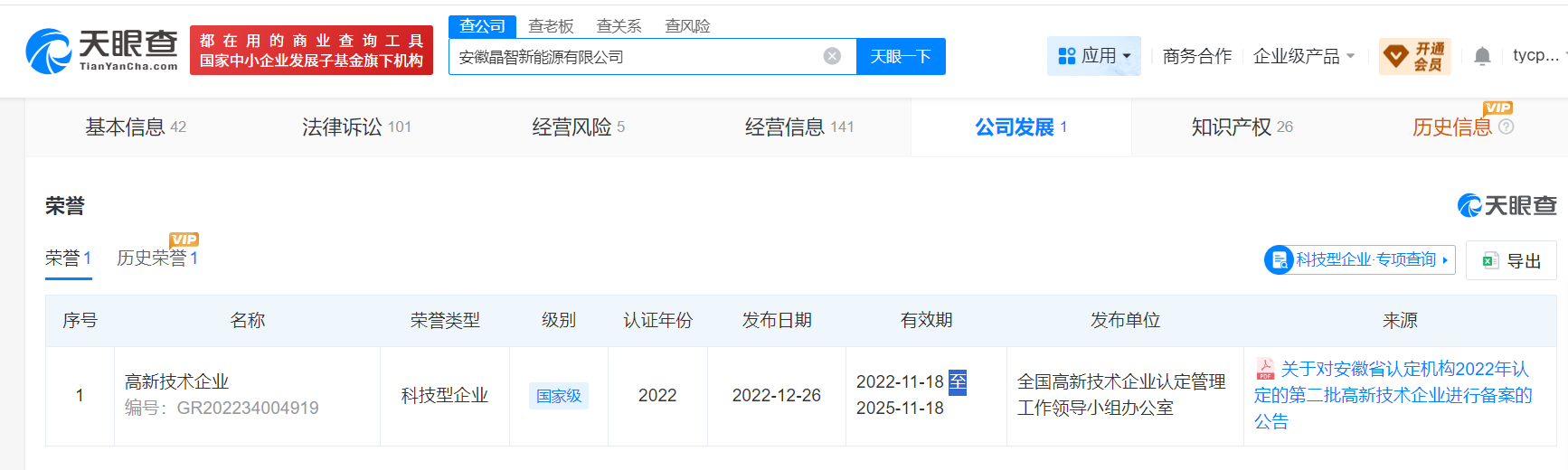 安徽晶智新能源有限公司 (曾用名:安徽宣铝新材料科技有限公司) ,成立于2020年,位于安徽省宣城市,是一家以从事制造业为主的企业。2025年7月3日,该公司因未依照《企业信息公示暂行条例》第八条规定的期限公示年度报告,被列入经营异常名录,2022年该公司入选国家级高新技术企业有效期为2022年11月18日至2025年11月18日。