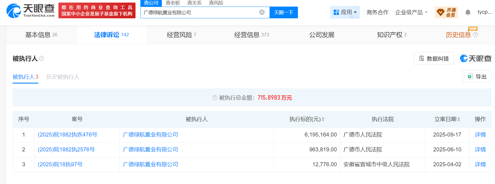 天眼查信息显示,广德绿航置业有限公司,成立于2019年,上海东方康桥房地产发展成员,位于安徽省宣城市,是一家以从事房地产业为主的企业。该公司2025年存在3条被执行信息,被执行总金额715.8983万元。