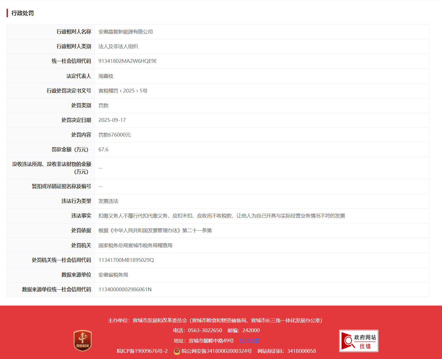 依据《中华人民共和国税收征收管理法》第六十三条、根据《中华人民共和国发票管理办法》第二十一条,宣城市相关部门分别对上述公司处罚款61.447561万元、67.6万元、5.127063万元、14.448492万元、6.634826万元、22.360972、10万元,合计187.618914万元。