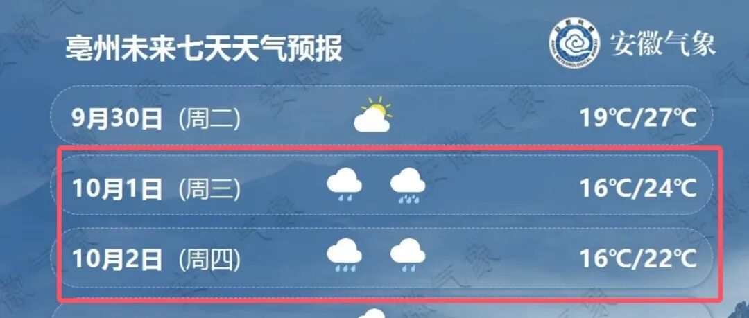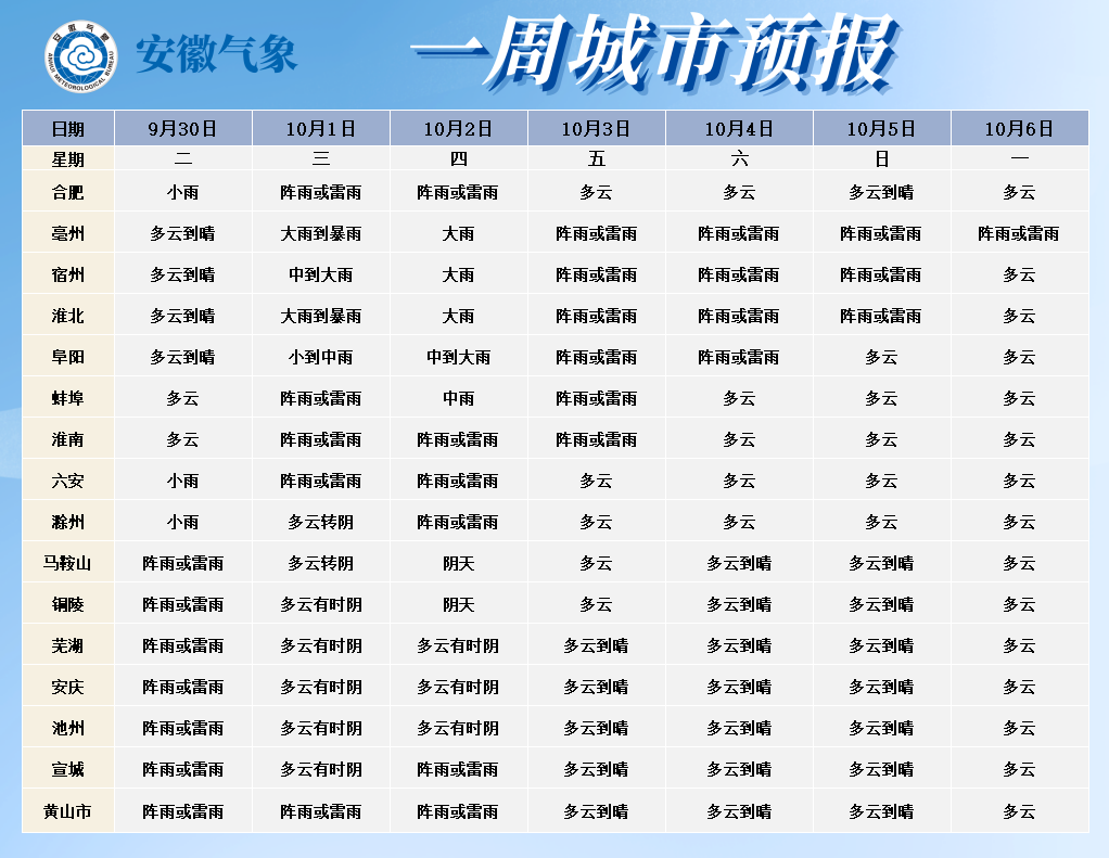 10月1日(周三):江北多云转阴天,大部分地区有小雨,其中淮河以北部分地区中到大雨,局部暴雨;江南多云有时阴天,局部地区有阵雨或雷雨。
