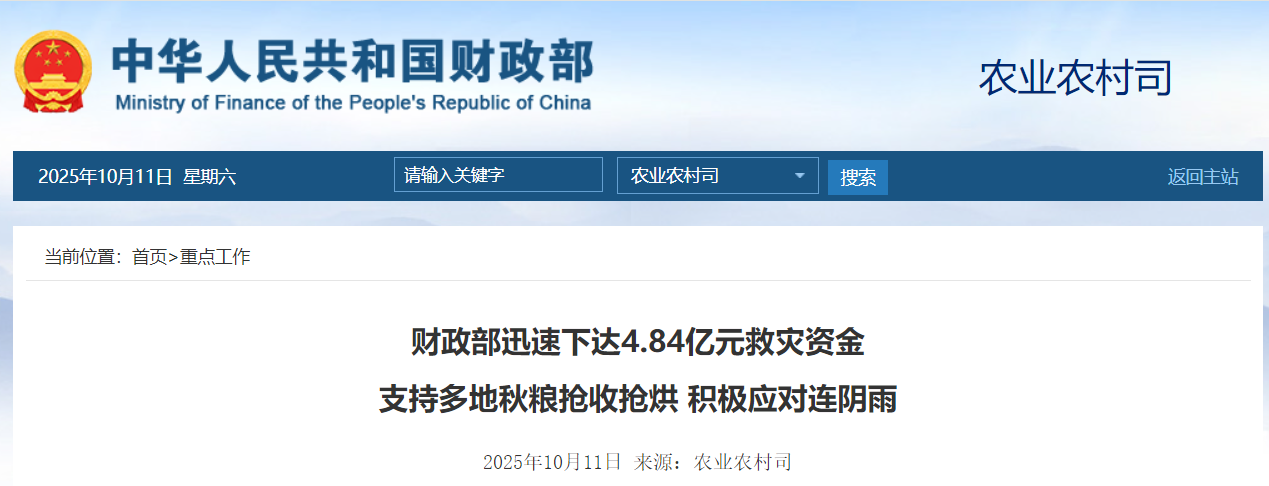 贯彻落实党中央、国务院决策部署,为积极应对连阴雨影响,近日,财政部会同农业农村部下达中央财政农业生产防灾救灾资金4.84亿元,支持河北、山西、江苏、安徽、山东、河南、陕西等7省受灾地区加快开展农机抢收、潮粮烘干、农田排涝等农业生产防灾救灾工作,保障秋粮丰收到手、颗粒归仓。