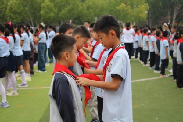 佩戴仪式后,新队员在大队委带领下庄严宣誓:“我热爱中国共产党,热爱祖国,热爱人民……准备着为共产主义事业贡献力量!”誓言铿锵,彰显新时代少年的责任担当。