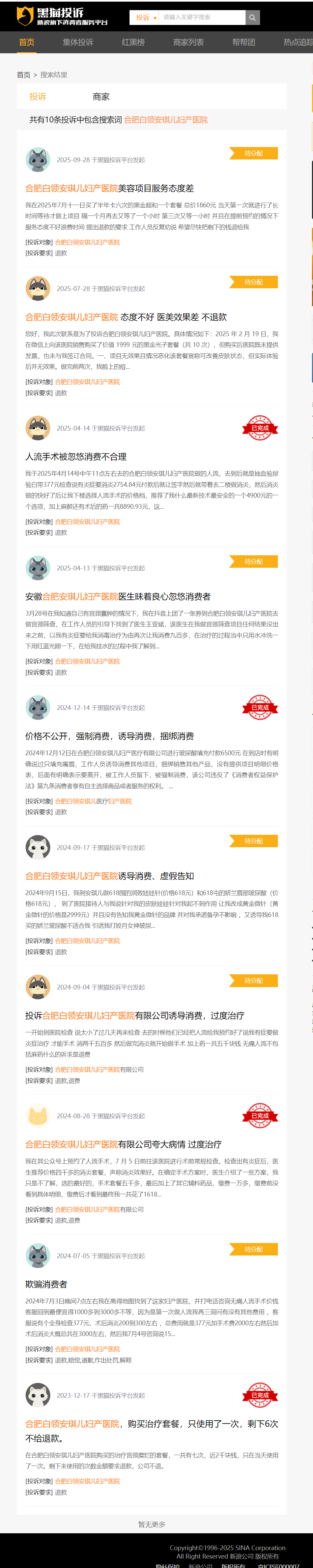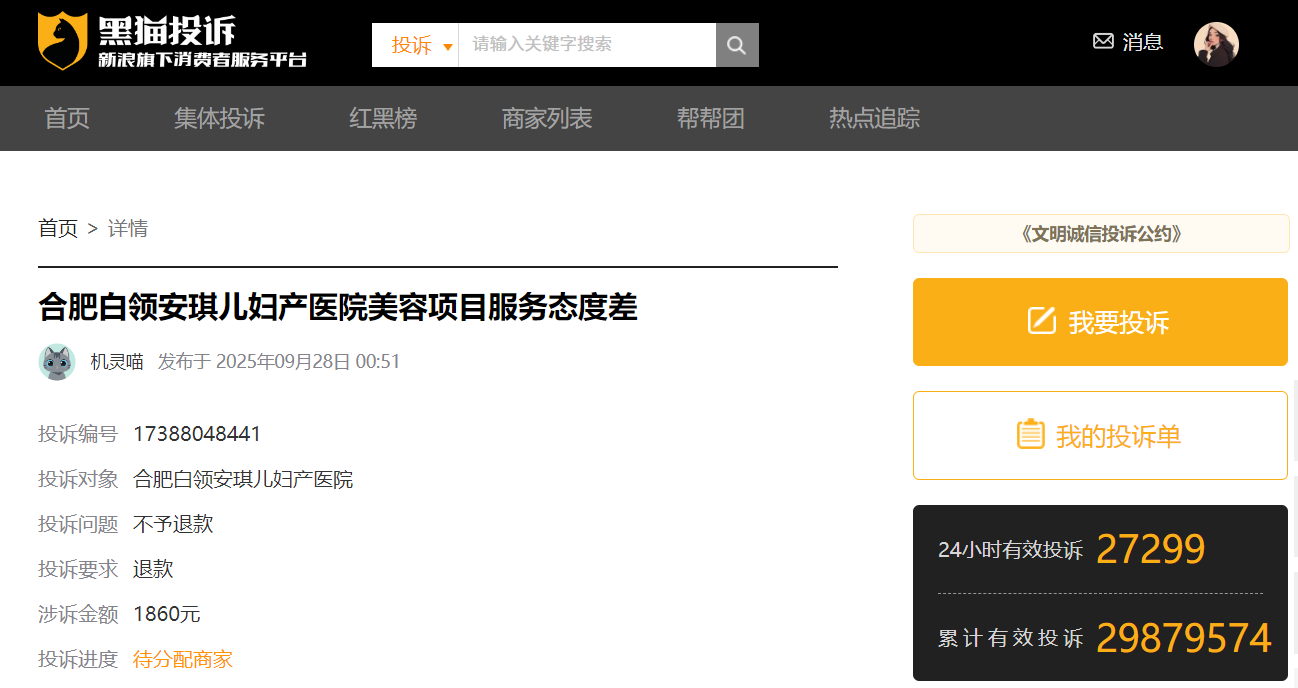 此外,在黑猫投诉平台上,合肥白领安琪儿妇产医院还存在多条投诉信息,投诉事由涉及诱导消费、虚假告知,夸大病情、过度治疗等。